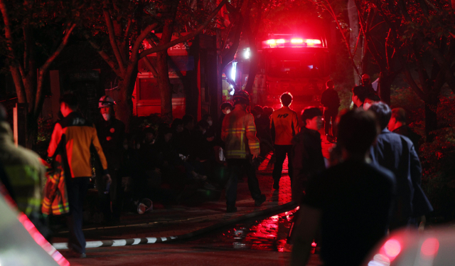 대구에서 발생한 대형 산불이 이틀 만에 진화됐다가 일부에서 재발화하며 확산하는 가운데 30일 오후 9시 30분께 대구 북구 구암동 일대 등산로 입구에서 밤샘 진화에 나선 진화 요원들이 잠시 휴식을 취하고 있다. 연합뉴스