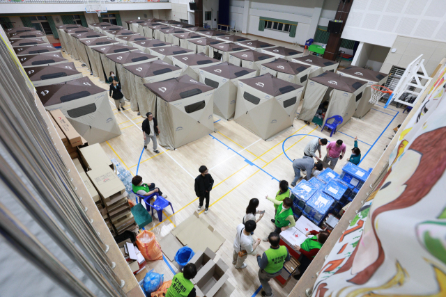대구에서 발생한 대형 산불이 이틀 만에 진화됐다가 일부에서 재발화하며 확산하는 가운데 30일 오후 대구 북구 동변중학교에 마련된 대피소에 텐트가 설치돼 있다. 동변중학교는 약 150명 수용 규모지만 이날 운영을 시작한 오후 5시부터 두 시간 만에 피난 주민으로 가득 찼다. 연합뉴스