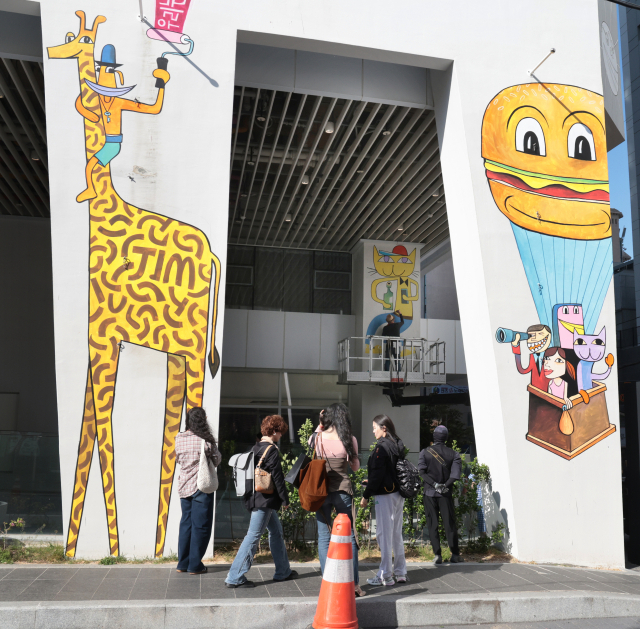 부산 수영구 광안리에서 지난해 8월 문을 연 복합문화공간 포디움다이브 외벽 벽화 작업 중인 짐 아비뇽 작가. 김은영 기자