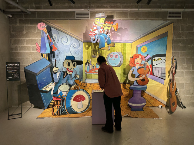 부산 수영구 광안리에서 지난해 8월 문을 연 복합문화공간 포디움다이브 내 갤러리에서 전시 중인 짐 아비뇽 작품을 한 관객이 돌아보고 있다. 김은영 기자