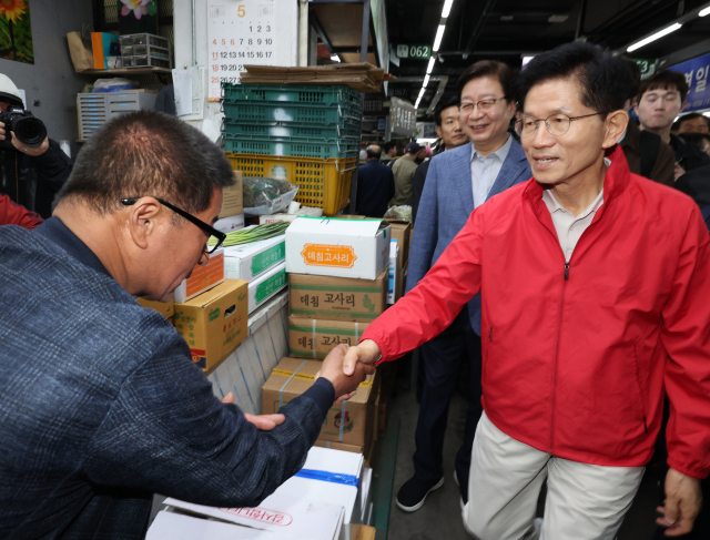 제21대 대통령 선거 공식 선거운동 첫날인 12일 국민의힘 김문수 대선 후보가 서울 송파구 가락시장을 찾아 상인들과 인사하고 있다. 연합뉴스