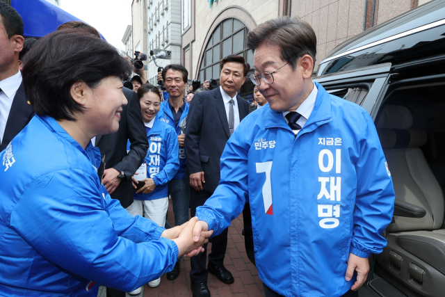 더불어민주당 이재명 대선 후보가 13일 '보수의 심장'이라고 불리는 대구광역시의 동성로 거리에서 집중 유세를 마친 후 서영교 의원과 악수하고 있다. 연합뉴스
