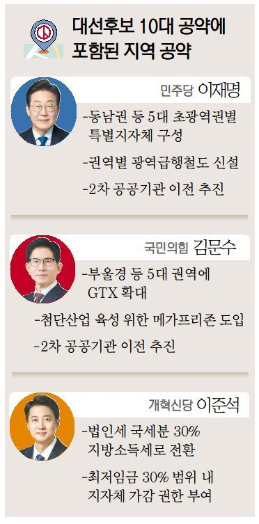 6·3 대통령선거를 앞두고 주요 후보들이 발표한 10대 공약 속 지역 공약의 비중과 실현 가능성에 대한 우려가 제기된다. 공개된 공약 대다수가 과거 정책의 반복이거나 실현 가능성이 불투명한 구상이라는 평가가 나오기 때문이다. 대선 자체가 급하게 치러지면서 지역 공약이 구색 맞추기용으로 전락한 것 아니냐는 지역의 비판이 적지 않다.