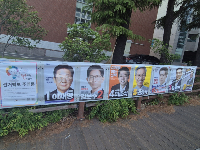 울산시 중구 폴리텍대학 인근에 대통령선거 후보자들의 벽보가 붙어 있다. 경찰은 18일 선거벽보 중 이재명 후보 사진이 훼손된 사실을 발견, 시선관위에 통보했다. 현재 훼손된 벽보가 새 벽보로 교체돼 있다. 권승혁 기자