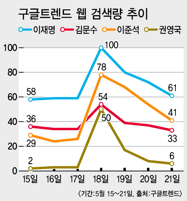 흔히 전문가들은 TV 토론이 유권자의 표심을 바꾸는 데 큰 영향을 주지 못한다고 말한다. 시간 등 제약으로 후보 검증 효과가 크지 않기 때문이다. 그러나 온라인상 후보 각각에 대한 관심만큼은 TV 토론을 전후로 크게 바뀌었다.