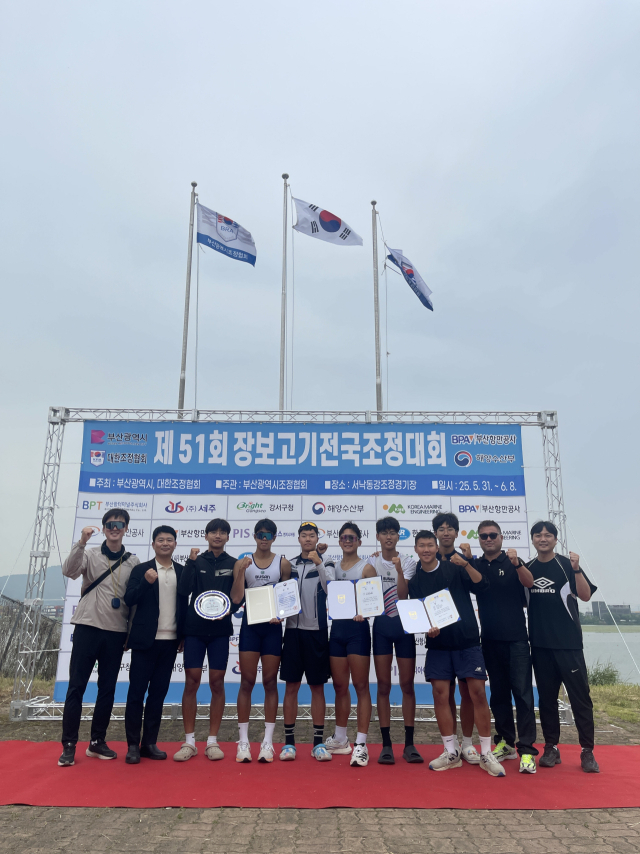 부산체고 선수들이 제51회 장보고기 전국조정대회에서 종합 우승을 차지한 뒤 기념촬영을 하고 있다. 부산체고 제공