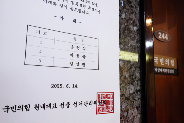 국민의힘 차기 원내대표 선출을 하루 앞둔 15일 서울 여의도 국회에 공고문이 붙어 있다. 연합뉴스
