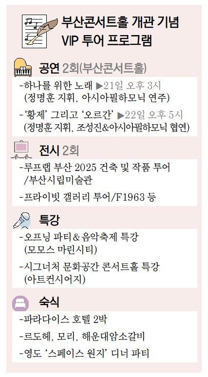 그럼에도 부산에서만 볼 수 있는 문화예술 콘텐츠가 포함되자 전국적인 관심을 끈 것으로 풀이된다. 이번 상품의 핵심 프로그램은 두 차례의 부산콘서트홀 개관 공연이다. 오는 21일 오후 3시 ‘하나를 위한 노래’(정명훈 지휘, 아시아필하모닉 연주), 22일 오후 5시 ‘황제, 그리고 오르간’(정명훈 지휘, 조성진&아시아필하모닉 협연)을 관람할 수 있다. 세계적 지휘자와 스타 피아니스트가 나오는 공연에 대한 갈증을 부산 관광이라는 상품을 통해 해소해 준다는 점에서 큰 호응을 얻은 것으로 보인다.