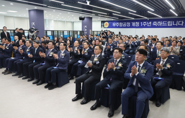 지난달 27일 정부 관계자들이 모인 가운데 경남 사천시 우주항공청에서 제1회 우주항공의 날 기념식이 열리고 있다. 우주항공청 개청을 기념해 제정한 이날 첫 기념식은 경기도에서 치러질 예정이었으나 경남의 여론이 악화되자 급히 개최지를 사천으로 바꾸는 등 소동을 겪었다. 연합뉴스