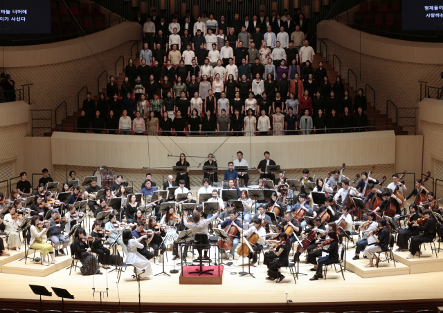 20일 오후 7시 30분 부산진구 연지동 부산시민공원에 자리한 부산콘서트홀. 무대 뒤 합창단석을 제외한 1600여 좌석을 가득 채운 가운데 개관기념 공연 ‘하나를 위한 노래’가 시작됐다. 숨죽인 채 공연 시작을 기다리던 관객들은 무대 양쪽 문을 통해 연주를 맡은 아시아필하모닉오케스트라(APO) 단원들이 입장하자 박수로 환영했다. 곧이어 들어선 박지윤(바이올리니스트) 악장이 피아노 음을 점검하고 단원들과 짧게 화음을 확인했다.