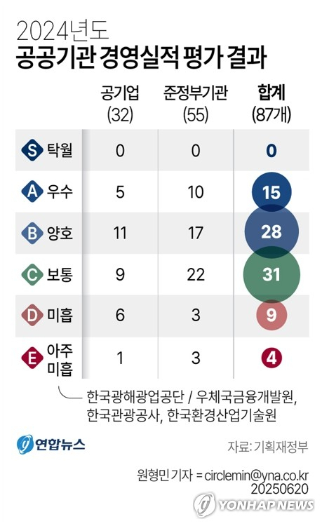 한편, ‘2024년도 감사 직무수행실적 평가결과’에서는 남동발전(진주), 기술보증기금(부산) 등 4곳이 '우수', 30곳이 '양호', 20곳이 '보통', 4곳이 '미흡' 평가를 받았다. '탁월'과 '아주미흡' 평가를 받은 기관은 없었다. 올해 공공기관 평가는 올해 2월부터 4개월간 현장실사·이의제기·외부검증 등 절차에 따라 이뤄졌다.