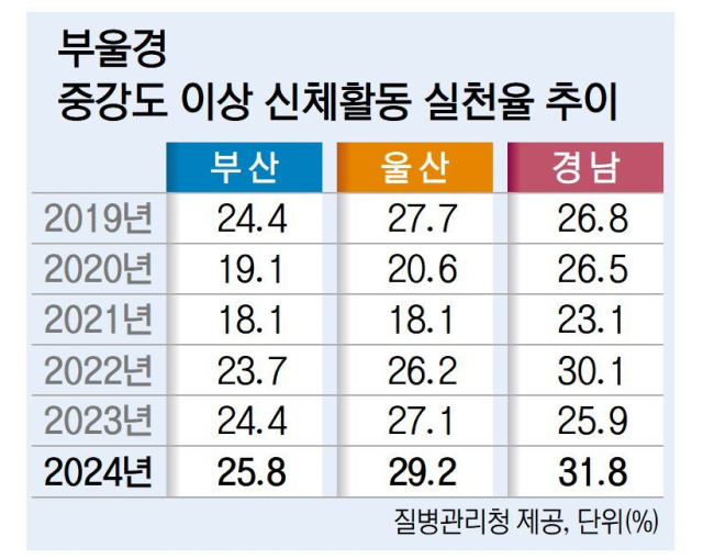 2022~2024년 중강도 이상 신체활동 실천율을 보면 부울경에서 가장 많이 신체활동을 한 곳은 경남 창녕군으로 46.3%에 달했다. 경남 의령군(43.9%), 경남 창원시 진해구(41.7%) 등이 뒤를 이었다. 가장 실천율이 낮은 곳은 부산 동래구로 18.7%에 그쳤다.