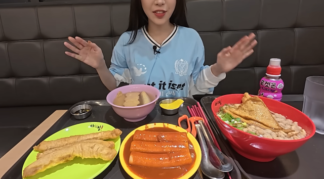 진한 붉은색 양념의 떡볶이. 양념 색에 비해 맵지 않다. 쯔양 유튜브 캡처