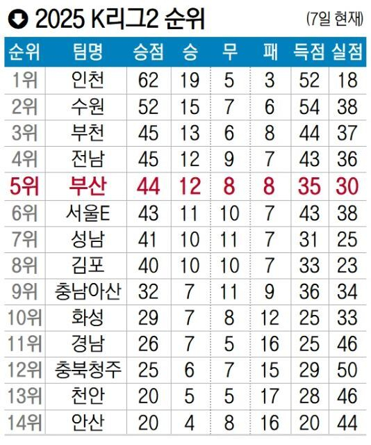 조성환 감독이 이끄는 부산은 지난 6일 부산 구덕운동장에서 열린 수원과의 하나은행 K리그2 2025 28라운드 홈 경기에서 1-0으로 이겼다.