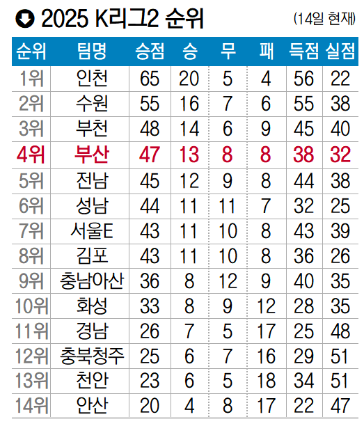최근 2연승을 포함해 5경기 무패(4승 1무) 행진을 이어간 부산은 13승 8무 8패(승점 47)로 전남 드래곤즈(승점 45)를 끌어내리고 4위에 올랐다. 바로 윗 순위인 부천FC(승점 48)를 승점 1점 차로 바짝 뒤쫓고 있는 부산은 상승세를 이어간다면 3위권 진입이 가능한 상황이다.