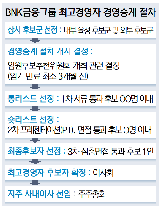 BNK금융그룹이 지주 회장을 비롯해 그룹의 주요 계열사 대표를 선정하는 최고경영자(CEO) 경영 승계 절차에 본격 돌입했다.