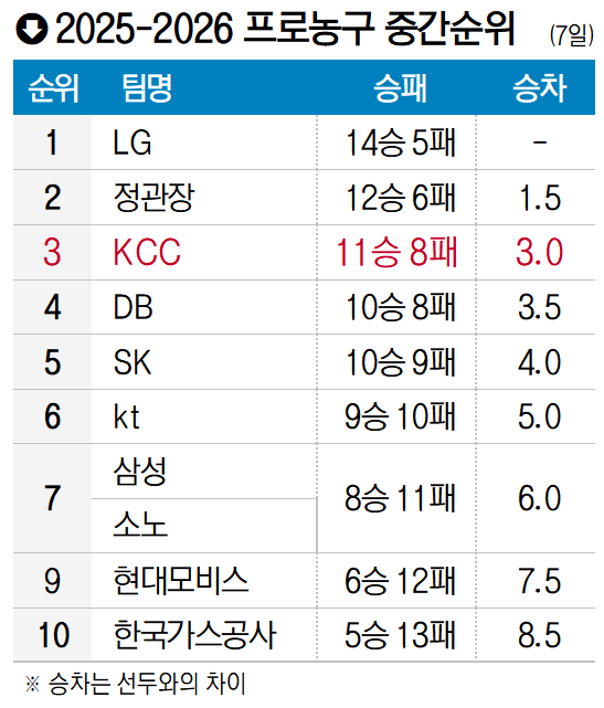KCC는 8일 현재 11승 8패로 단독 3위에 올라 있다. 선두 창원 LG(14승 5패)에 3경기 차, 2위 안양 정관장(12승 6패)에 1.5 경기 차이 밖에 나지 않는다. 올 연말까지 이어지는 홈 8연전에서 홈 팬들의 열렬한 응원 속에 언제든 선두로 치고 올라 갈 수 있다.