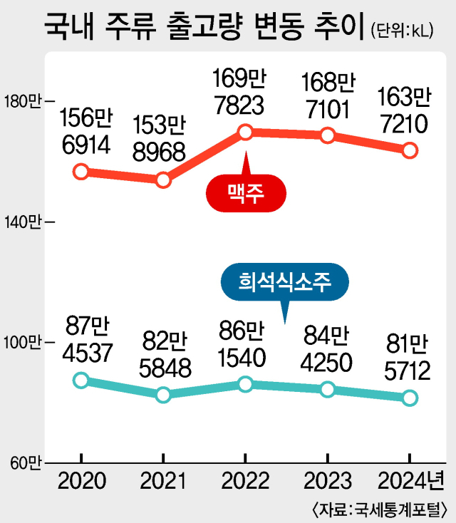 주류업계 관계자는 “소맥(소주+맥주)으로 대표되는 술자리 대신 ‘러닝’을 즐긴다는 말이 나올 정도로 술자리 문화가 빠르게 바뀌고 있다”며 “새로운 트렌드에 맞는 상품을 개발하는 동시에 수출로 돌파구를 찾고 있다”고 전했다.