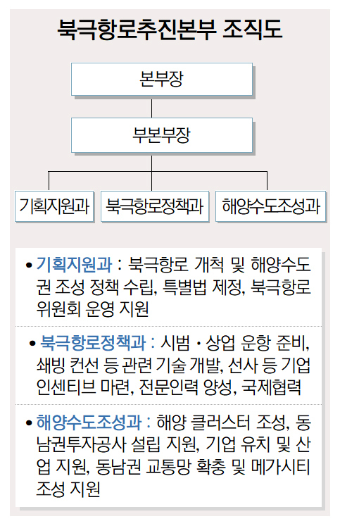 북극항로추진본부는 3개 과 31명 규모로 꾸려졌다. 구성원은 해수부를 주축으로 산업·행안·국토·기재·외교부 등 10개 부처와 지방자치단체(부산·울산·경남) 및 공공기관 파견 직원이다.