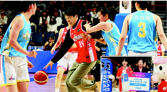 4일 부산 사직체육관에서 열린 BNK금융 2025-2026 여자프로농구 올스타페스티벌. 팀 포니블 이명관(우리은행)이 팀 유니블 위성우(우리은행) 감독을 집중 마크하고 있다. 오른쪽 아래 사진은 3점슛 콘테스트에서 우승한 BNK 이소희. 연합뉴스