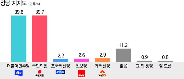 이 같은 배경이 작용하면서 민주당과 국민의힘 정당 지지율은 사실상 동률 수준으로 좁혀졌다. 국민의힘 지지율은 39.7%로 조사됐고, 민주당 지지율은 39.6%로 나타났다. 양당 지지율이 0.1%P 차에 그친 것이다.