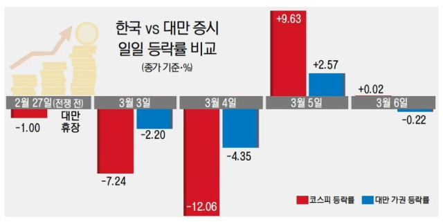 실제 미국과 이란 간 전쟁 발발 이후 2거래일 동안 코스피가 약 20% 폭락했고 일본 니케이(7.82%)와 대만 가권지수(7.3%)도 크게 하락했다. 같은 기간 미국 S&P500과 나스닥이 1%도 채 하락하지 않은 것과 비교하면 낙폭은 훨씬 컸다.