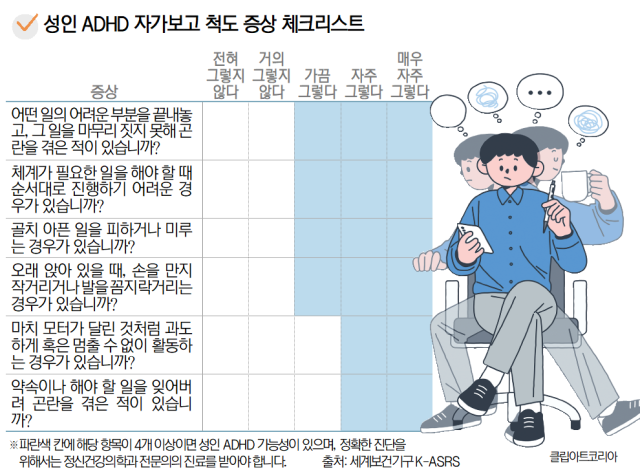 성인 ADHD 진단을 위해서는 최소 6개월 이상 지속되는 부주의 또는 충동성 증상이 있어야 하며, 직장·가정 등 2개 이상 환경에서 문제가 나타나야 한다. 서 진료부장은 “집에서는 증상이 나타나는데 직장에선 별일이 없으면 성인 ADHD가 아닌 것이다”라고 말했다. 무엇보다 중요한 것은 일상 기능의 손상이다. 반복적으로 일상적 업무 마감이 어렵거나 재정 관리에 문제가 발생하거나 사회적 관계에서 갈등이 지속되는 ‘일상 기능 손상’이 일어난다면 병원 진료가 꼭 필요하다.