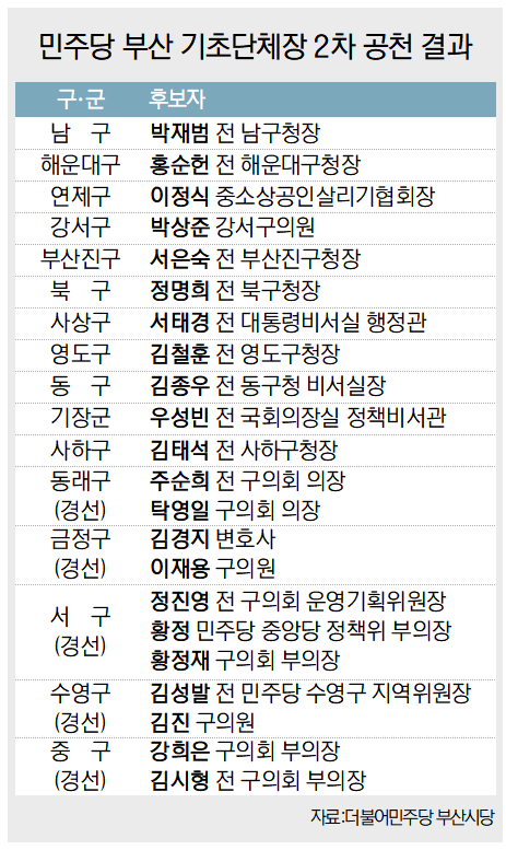 전직 구청장을 중심으로 인지도와 조직력을 갖췄다고 평가 받은 인물들은 단수 추천 대상에 포함됐다. 앞서 1차 심사 때 박재범 전 구청장(남구), 이정식 중소상공인살리기협회장(연제구), 홍순헌 전 구청장(해운대구), 박상준 구의원(강서구), 서은숙 전 구청장(부산진구), 정명희 전 구청장(북구), 서태경 전 대통령비서실 행정관(사상구), 김철훈 전 구청장(영도구)이 단수 추천됐다.