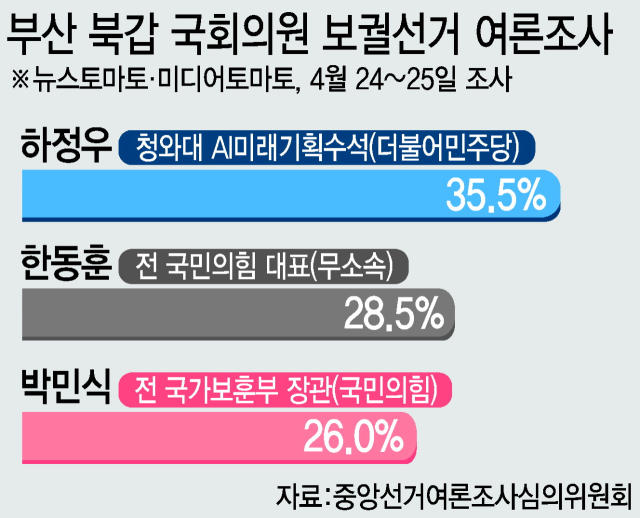 27일 발표된 미디어토마토 조사(뉴스토마토 의뢰. 4월 24~25일. 부산 북갑 성인 802명. 무선 ARS. 중앙선거여론조사심의위 참조) 결과는 이를 단적으로 보여준다. 이날 출마 의사를 굳힌 하정우 청와대 AI미래기획수석과의 3자 가상대결에서 하 수석이 35.5%의 지지율로, 한 전 대표(28.5%)와 박 전 장관(26.0%)을 오차범위 내에서 앞서고 있는 것으로 나타났다. 그러나 한 전 대표와 박 전 장관의 지지율을 합치면 54.5%로 하 수석을 앞서게 된다. 물론 두 사람이 단일화한다고 해서 개별 지지율이 그대로 합쳐질 지는 미지수지만, 보수 진영에 유리한 상황이 조성되는 것은 분명하다.