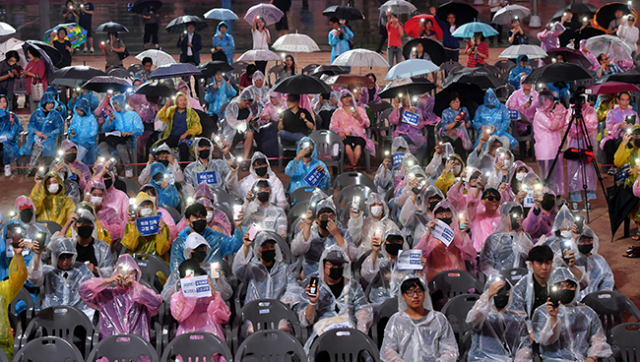 28일 오후 6시 30분께 부산대 넉넉한터. 비가 오는 궂은 날씨에도 100여 명의 부산대 재학생·졸업생들이 자리에 앉아 휴대폰 플래시를 흔들며 구호를 외쳤다. ‘부산대학생들의 촛불집회추진위원회’는 이날 대학 본부에 조 후보자 딸 의혹 관련 진상 규명을 요구하는 촛불집회를 개최했다.