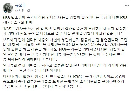 송요훈 기자는 9일 자신의 페이스북에 "(KBS가) 보도하기 전에 인터뷰 내용이 사실에 부합하는지 검증하는 것은 당연하다"며 "그런데 왜 하필 수사팀에 확인을 요청했나. 다른 투자전문가들이나 관계자들을 통해 확인하고 검증을 해야 한다"고 말했다.