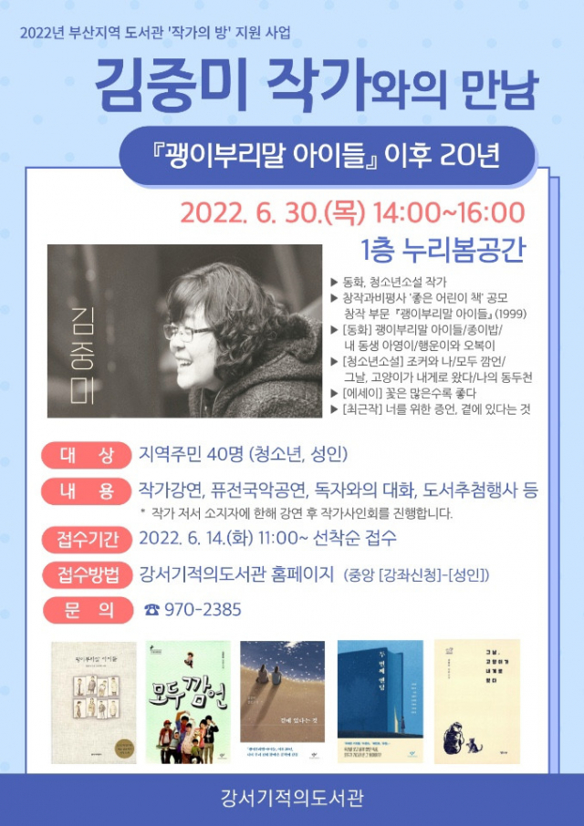 강서 기적의 도서관은 오는 30일 2022년 부산지역 도서관 '작가의 방' 지원 사업의 일환으로 '괭이부리말 아이들' 김중미 작가를 초대한다.