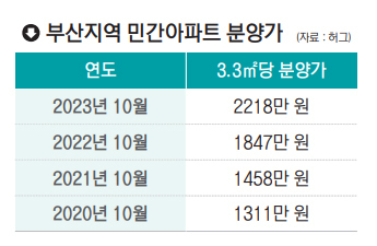 15일 주택도시보증공사가 발표한 ‘민간아파트 분양가격 동향’에 따르면 지난 10월 부산지역 아파트 분양가격은 ㎡당 672만 2000원을 기록했다. 이를 3.3㎡(평)로 환산하면 2218만 원 수준이다. 월별 분양 가격은 공표직전 12개월간 자료를 평균한 가격이다. 2022년 10월 부산지역 아파트 분양가는 ㎡당 559만 7000원으로 3.3㎡당 1847만 원이었다. 1년 사이 3.3㎡당 분양가가 371만 원(20.1%) 올랐다.