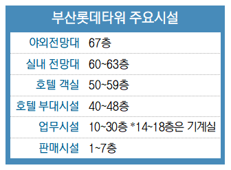 변경 설계안의 핵심은 최초에 빈 공간으로 계획했던 타워 중층부를 5성급 호텔과 부대시설, 오피스로 채워 넣는다는 점이다. 기존 설계안은 지하 7층~지상 67층, 높이 342.5m에 이르는 부산롯데타워를 전망대로 조성하는 데 초점을 맞췄다. 1~13층을 롯데백화점 광복점과 연결해 판매 시설로 활용하고, 14~54층에 이르는 타워 중층부는 대부분 비워둔 채 상층부를 전망대와 갤러리 등으로 조성한다는 계획이었다.