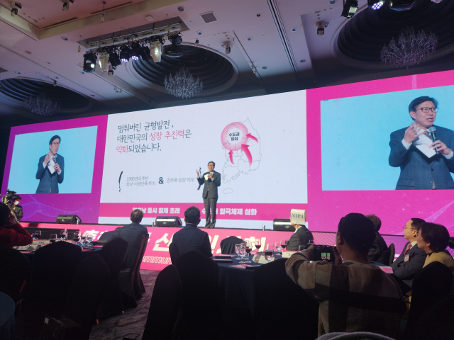 박형준 부산시장이 17일 서울 소공동 롯데호텔에서 열린 '2025년 부산 출향인사 신년 인사회'에서 부산의 혁신과 변화에 대한 브리핑을 하고 있다. 곽진석 기자 kwak@