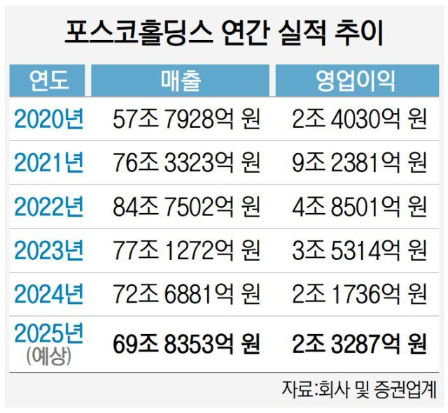 포스코홀딩스는 최정우 전 회장 재임 당시인 2021년 창사 이래 최대인 76조 3323억 원의 매출을 기록한 뒤, 2022년 84조 7502억 원으로 정점을 찍었다. 이후 2023년 77조 원대를 기록했고, 장인화 회장 취임 첫해인 2024년에는 72조 6881억 원으로 내려앉으며 하락세를 보였다.