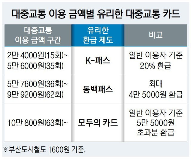 이에 따라 대중교통을 많이 타는 사람이라면 모두의 카드를 사용하는 게 유리하다. 부산도시철도 1구간 금액(1600원)을 기준으로 일반 이용자가 한 달에 63번 이상 이용해 요금이 10만 800원인 순간부터 모두의 카드가 비용을 절약할 선택지다. 모두의 카드 환급금이 4만 5800원으로 동백패스 환급금(4만 5000원)보다 많다.