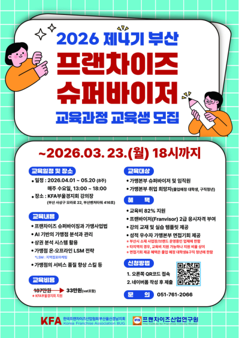 프랜차이즈 슈퍼바이저' 교육 과정이 2026년 4월 1일부터 5월 20일까지 8주간 부산벤처타워에서 진행된다.
