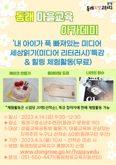 신청서를 제출하려는 경우에는 동래구청 6층 평생교육과로 방문 또는 이메일(접수 시 유선 확인 필수)로 접수하면 되고, 기타 자세한 사항은 동래구 평생교육과로 문의하면 된다.